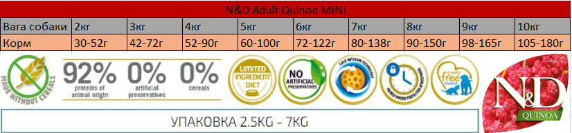 ND Quinoa Neutered – повнораціонний сухий корм для дорослих стерилізованих/кастрованих собак дрібних порід. Качка, кіноа, броколі та спаржа.