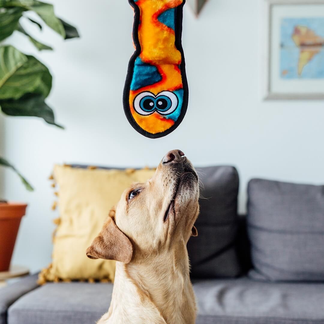 БЕЗ НАПОВНЮВАЧІВ = БЕЗ СМІТТЯ: при створенні цього шаленоокого героя, ми не поклали всередину нічого зайвого – лише ОБОЖНЮВАНУ собаками пищалку, від якої всі собаки приходять у захват. Ця іграшка без зайвого пуху та наповнювачів, тому собаки можуть тягати змію та тиснути на пищалку більш потужно, ми продумали кожну деталь.
