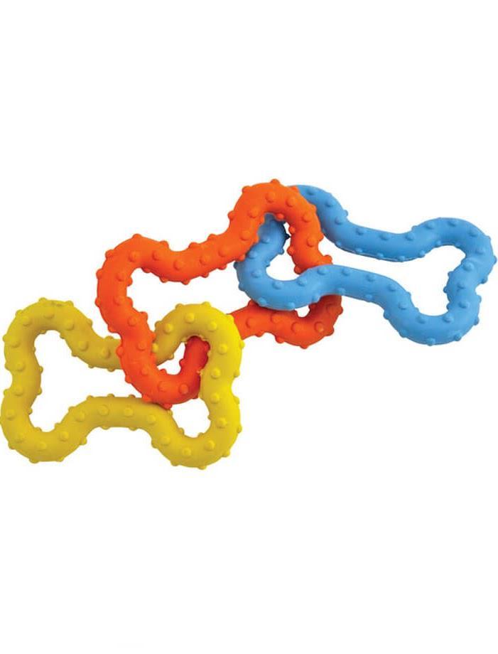 Ці кісточки ідеальна забава для малих собак та цуценят! Три гумові кісточки скріплені між собою. Іграшка виготовлена з нетоксичної витривалої гуми та має виступи які допомагають очищувати зуби від нальоту та забезпечують масаж ясен.