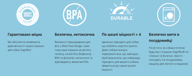 Відповідають вимогам FDA (Управління продовольства і медикаментів США) – це означає, що іграшка безпечна, навіть якщо собака відгризе і з'їсть її кусочки