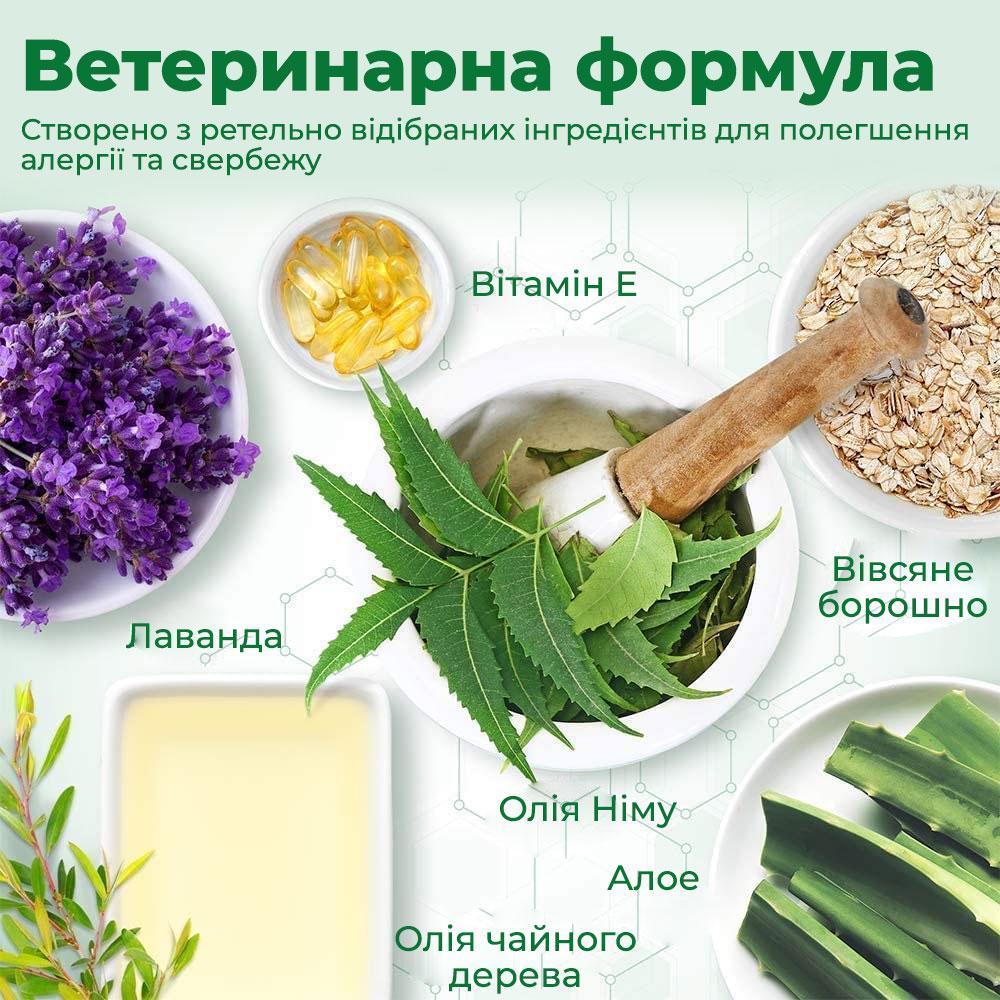 • Формула розроблена ветеринарами містить суміш есенціальних олій та ефективних натуральних інгредієнтів, таких як D-лімонен та олія чайного дерева.