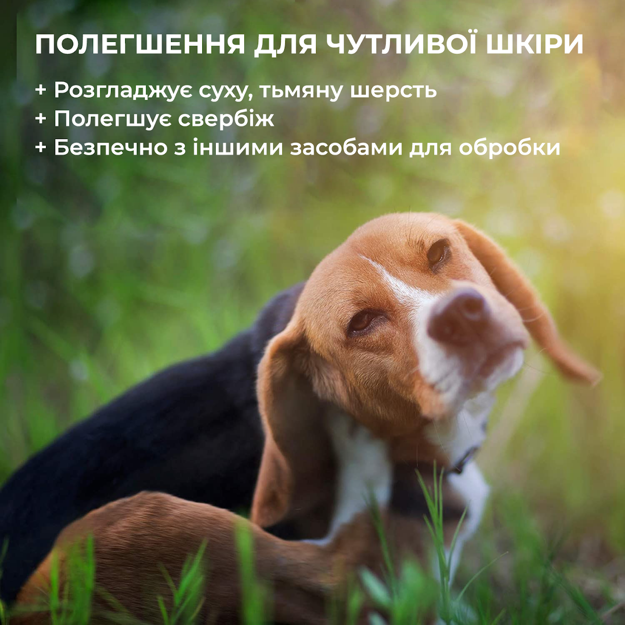 • ЗАСПОКОЄННЯ ЧУТЛИВОЇ ШКІРИ – гіпоалергенний шампунь для собак, створений для собак з чутливою шкірою, він не містить мила, усуває свербіж та допомагає відновлювати суху та тьмяну шерсть.