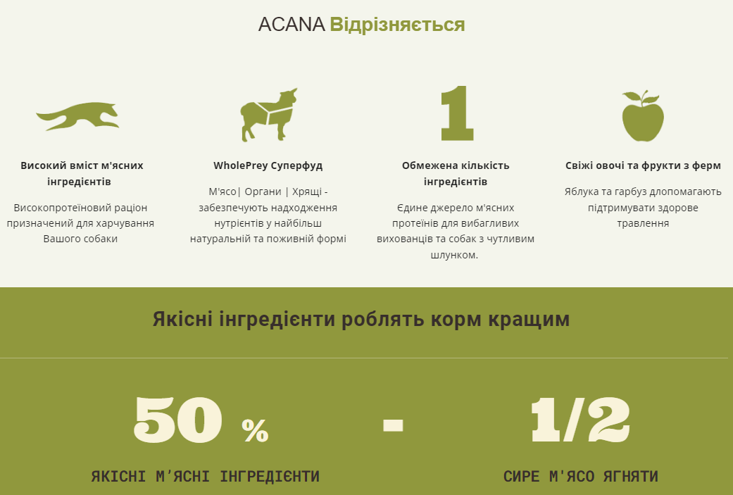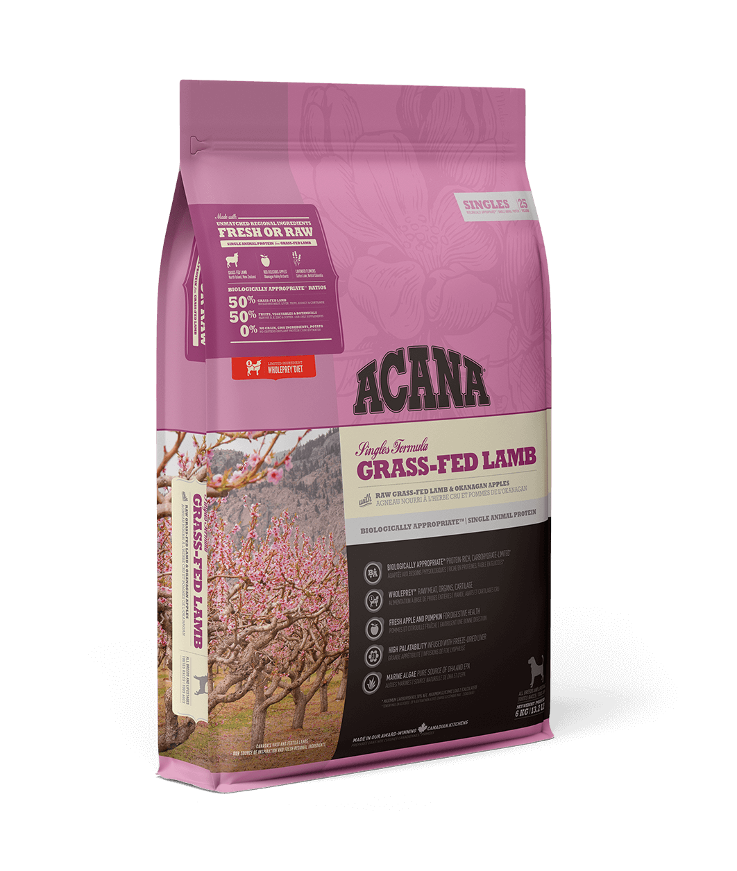 Обмежена кількість інгредієнтів зовсім не означає, що м’яса в кормі менше. Раціон ACANA Grass-Fed Lamb на 50% сповнений якісними м’ясними інгредієнтами у співвідношені WholePrey, включаючи м’ясо ягняти, органи та хрящі та вишукано доповнений неймовірно смачними яблуками сорту Ред Делішес. Раціон що забезпечує вашого собаку необхідними протеїнами та нутрієнтами, щоб він почувався щасливим, здоровим та сильним.