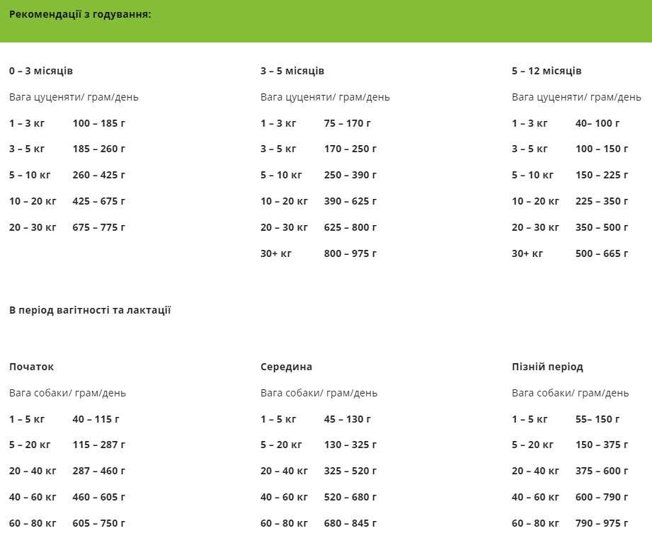 Норми, наведені у таблиці являються орієнтовними. Для вагітних та лактуючих сук рекомендовано забезпечити вільний доступ до корму.