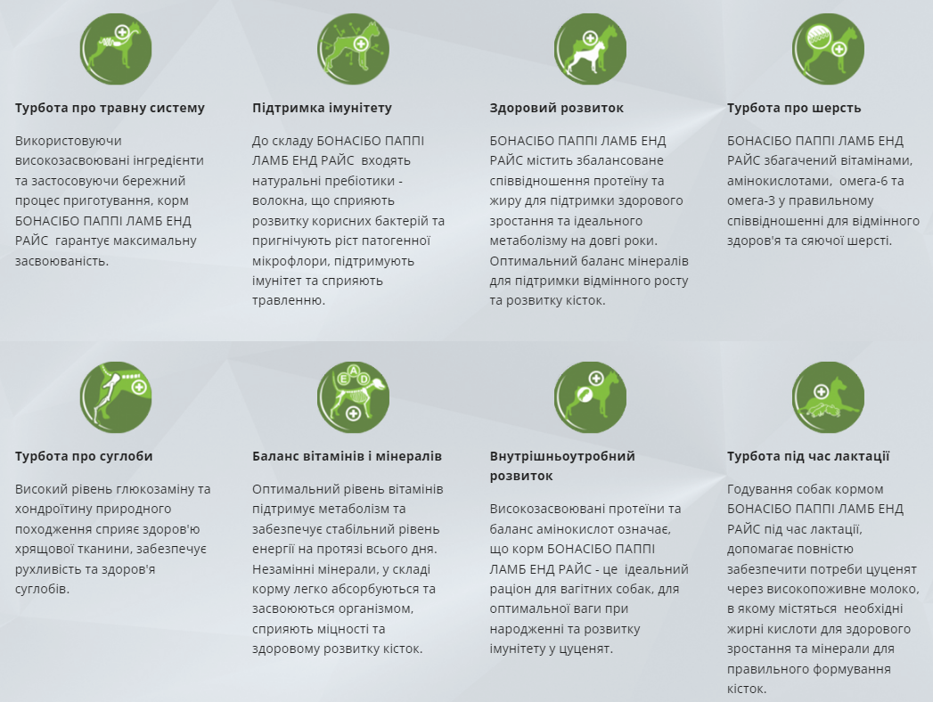 Формула БОНАСІБО ПАППІ ЛАМБ ЕНД РАЙС містить оптимальний баланс протеїнів, жирів та вуглеводів, забезпечує здорове зростання, покращує метаболізм та розвиток кісток. Цей раціон ідеальний для цуценят, які надають перевагу ніжному смаку ягняти, а також цуценятам з чутливим травленням.