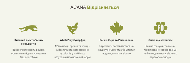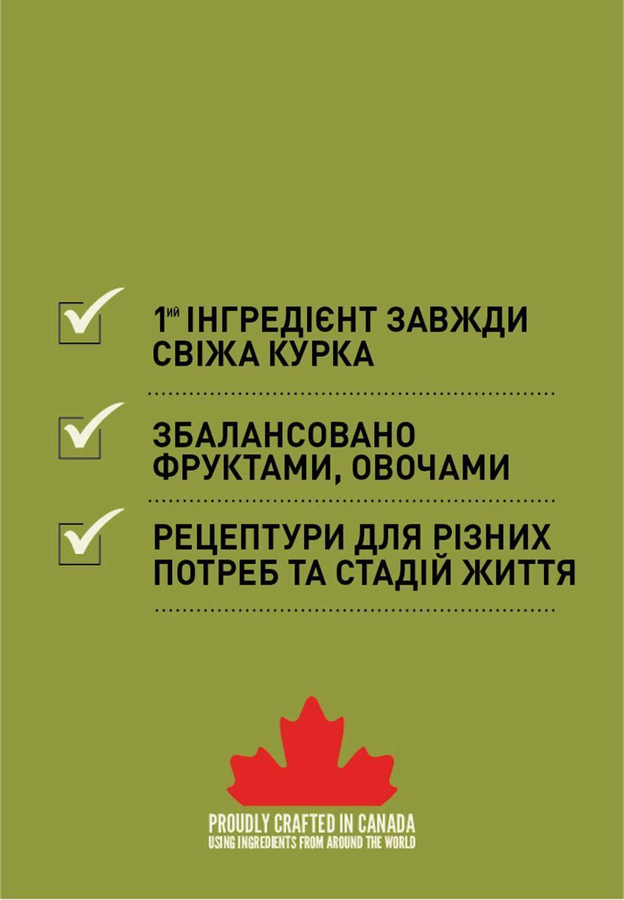 Свіжа курятина (18%), борошно з курки(18%), червона сочевиця, зелений горошок, cвіжий лівер курчати (печінка, серце) (7%), курячий жир (7%), борошно з індички(4%), яйця (4%), сира камбала (4%), борошно з оселедця (4%), риб’ячий жир (3%), зелена сочевиця, нут, жовтий горошок, клітковина з гороху, крохмаль з гороху, сира печінка індички (1%), сіль, висушена ламінарія, гарбуз, мускатний гарбуз, свіжа морква, свіжі яблука, свіжі груші, свіжі цукіні, висушений корінь цикорію, капуста Кале, шпинат, свіжа зелень ріпи, зелень буряка, свіжа цільна журавлина, свіжа чорниця, свіжі ягоди ірги, куркума, розторопша, корінь лопуха, лаванда, корінь алтеї, плоди шипшини.