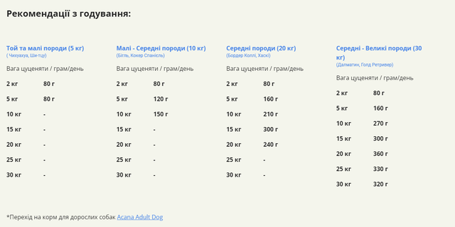 Раціон ACANA Puppy Recipe створений у відповідності до рівнів поживності встановлених FEDIAF для цуценят, за виключенням цуценят Датських Догів до 14 тижнів.