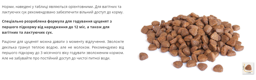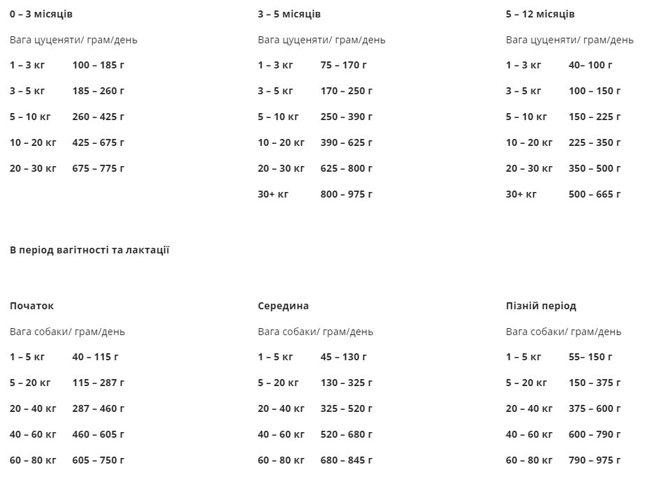 Норми, наведені у таблиці являються орієнтовними. Для вагітних та лактуючих сук рекомендовано забезпечити вільний доступ до корму.