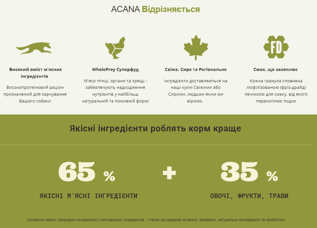 Рецептура приготована з якісних м’ясних інгредієнтів та збалансована овочами фруктами та травами, що доставляються на кухні компанії Champion Petfoods щоденно. Кожна порція корму АКАНА Лайт енд Фіт Ресіпе забезпечує вашого собаку харчуванням, таким яким би воно прибувало до вас на кухню з фермерських ринків.