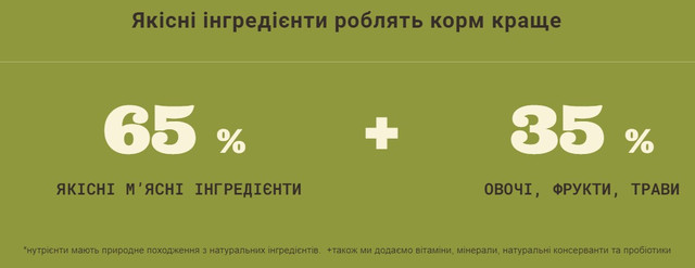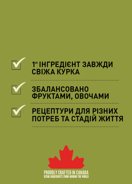 Свіжа курятина (20,5%), борошно з курки (20%), червона сочевиця, зелений горошок, клітковина з гороху, свіжий лівер курчати (печінка, серце) (5%), борошно з індички(5%), борошно з оселедця (4%), яйця (4%), сира камбала(4%), нут, зелена сочевиця, жовтий горошок, крохмаль з гороху, курячий жир (1%), риб’ячий жир(1%), сира печінка індички (0,5%), сіль, висушена ламінарія, гарбуз, мускатний гарбуз, свіжа морква, свіжі яблука, свіжі груші, свіжі цукіні, висушений корінь цикорію, капуста Кале, шпинат, свіжа зелень ріпи, зелень буряка, свіжа цільна журавлина, свіжа чорниця, свіжі ягоди ірги, куркума, розторопша, корінь лопуха, лаванда, корінь алтеї, плоди шипшини.