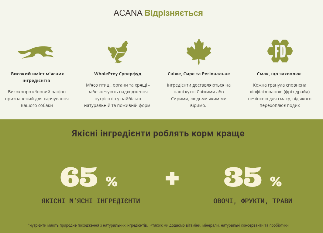Рецептура приготована з якісних м’ясних інгредієнтів та збалансована овочами фруктами та травами, що доставляються на кухні компанії Champion Petfoods щоденно. Кожна порція корму АКАНА Лайт енд Фіт Ресіпе забезпечує вашого собаку харчуванням, таким яким би воно прибувало до вас на кухню з фермерських ринків.
