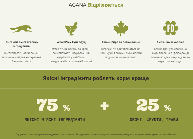 Коли це стосується корму ACANA, кожен інгредієнт має значення. Саме тому рецептура корму ACANA Sport&Agility Recipe створюється із турботою, щоб забезпечувати всі потреби дорослих активних собак у харчуванні. Рецептура АКАНА Спорт енд Аджиліті Ресіпі на 75% переповнена якісними м’ясними інгредієнтами, такими як м’ясо канадських курчат та сирої камбали та на 25% збалансовано фруктами, овочами та травами.