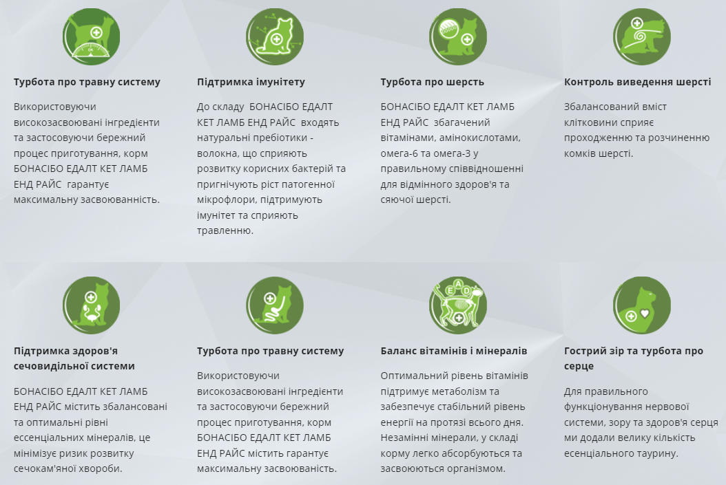 Корм БОНАСІБО ЕДАЛТ КЕТ ЛАМБ ЕНД РАЙС містить оптимальний баланс протеїнів жирів та вуглеводів та забезпечує організм енергією та здоров’ям впродовж усього життя. Збагачений антиоксидантами, вітамінами та рослинними екстрактами, корм БОНАСІБО ЕДАЛТ КЕТ ЛАМБ ЕНД РАЙС зміцнює здоров’я та імунітет. Ідеальний раціон для котів, які надають перевагу  ніжному смаку ягняти.