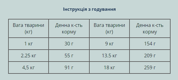 Аналітичні компоненти:Протеїн 32.0%, Жир 18.0%, Сира клітковина 4.0%, Сира зола 6.9%, Вологість 10.0%, Омега-6 2.8%, Омега-3 0.3%