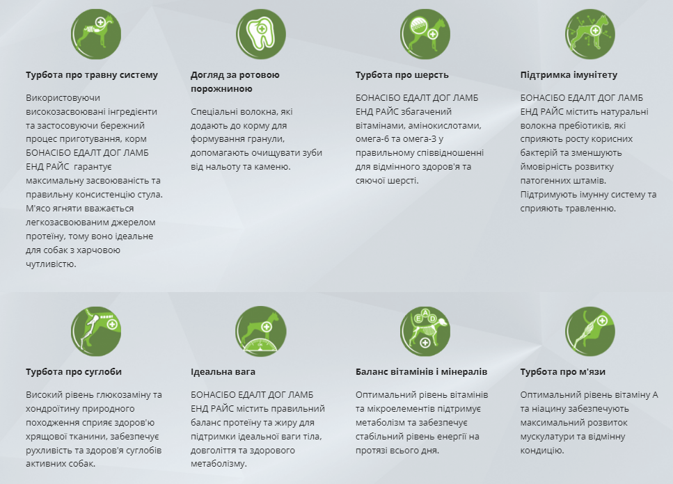 Формула БОНАСІБО ЕДАЛТ ДОГ ЛАМБ ЕНД РАЙС містить оптимальний баланс протеїнів, жирів та вуглеводів та забезпечує стабільне надходження енергії та відмінний стан на протязі всього життя. Ідеально для собак з чутливим травленням, або для собак, які надають перевагу ніжному смаку м’яса ягняти.