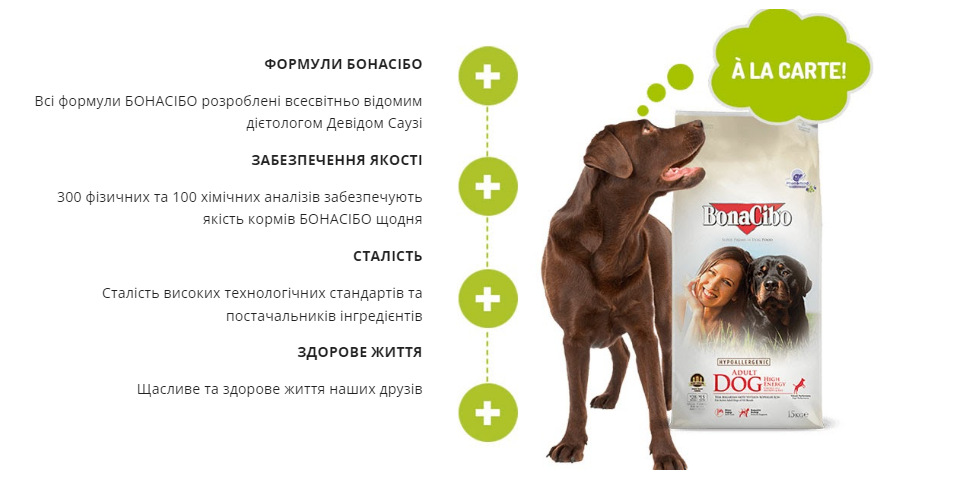 Завдяки ідеальним формулам та унікальним інгредієнтам БОНАСІБО пропонує нашим улюбленим чотирилапим друзям меню кормів “À la Carte”.