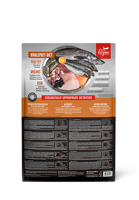 ОRIJEN™ – став піонером серед Біологічно Відповідних кормів та харчування, створеного у співвідношенні WholePrey. Біологічно відповідні раціони відтворюють багатство, свіжість та різноманітність м’ясних раціонів WholePrey , до споживання яких, коти та собаки пристосувались впродовж еволюційного розвитку. Саме тому, свіже або сире м’ясо птиці, риби та високопоживні органи –це завжди перші П’ЯТЬ інгредієнтів у списку кормів ORIJEN™.