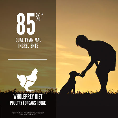 2/3 якісних м’ясних інгредієнтів у складі корму – це свіже або сире м’ясо, органи та кістки у високопоживному співвідношенні WholePrey, що значно знижує потребу у додаванні довгого списку синтетичних добавок.