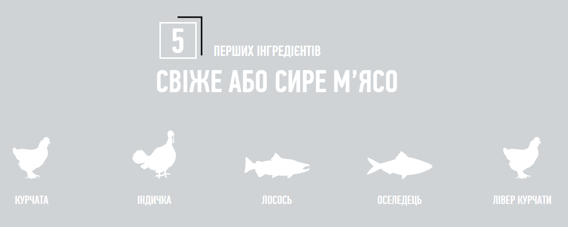 • Перші 5 інгредієнтів – це свіжі або сирі інгредієнти з риби або птиці. Наші свіжі інгредієнти ми охолоджуємо – єдиний метод зберігання, наші сирі інгредієнти заморожуються на піку їх свіжості.
