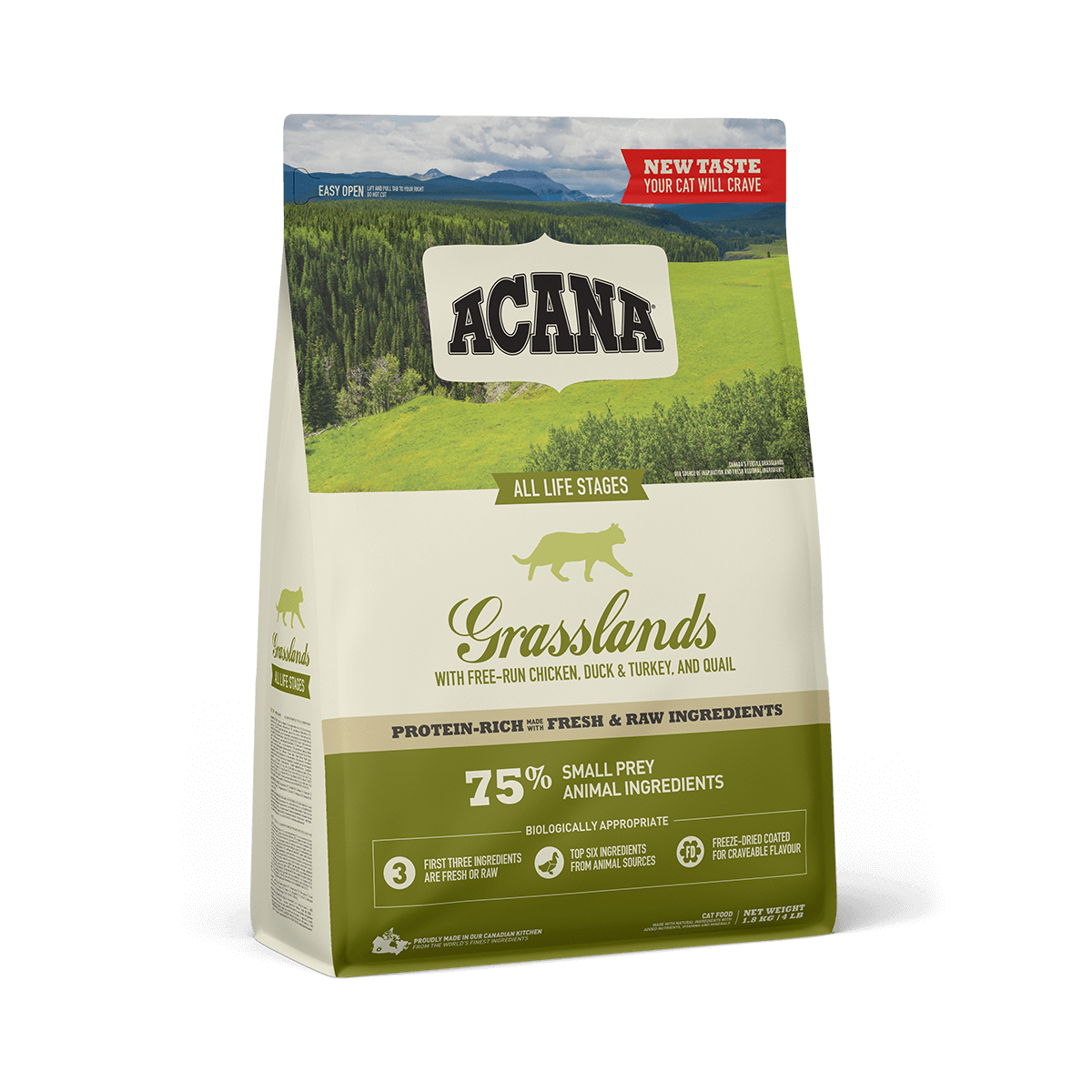 Коти потребують високопротеїнових м’ясних раціонів. Надихаючись обширними пасовищами та холодними північними озерами, наша рецептура АКАНА Гресслендс Кет сповнена м’ясом, курчат та качки вільного вигулу, гніздовими яйцями, рибою виловленою в дикій природі м’ясом індички та перепілки, вирощених на вільному вигулі. Інгредієнти представлені у співвідношені WholePrey включаючи м’ясо, органи, хрящі та кістки. Інгредієнти доставляються до нас на кухні свіжими або сирими, людьми яких ми знаємо та яким ми віримо. Ми пропонуєму вашому коту найкращі інгредієнти та рецептуру щоб, ваш кіт залишався щасливим, здоровим та сильним.