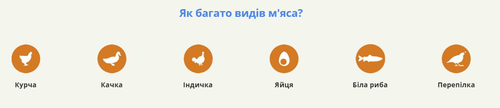 Свіже м’ясо качки (11%), свіже куряче м’ясо (11%), свіжі гніздові яйця (8%), дегідратоване куряче м’ясо (7%), дегідратоване м’ясо індички (7%), дегідратоване м’ясо білої риби (7%), квасоля строката, цільний горошок, свіже м’ясо індички (6%), жир качки (5%), цільна червона сочевиця, цільний нут, цільна зелена сочевиця, цільна перепілка (4%), свіжий лівер курки (печінка, серце) (2%), жир минтая (2%), свіжий лівер індички (печінка, серце) (2%), клітковина сочевиці, дегідратоване м’ясо качки (1%), печінка качки (1%), хрящі качки (0.5%), ліофілізована печінка курки та качки (0.5%), висушена ламінарія, свіжий гарбуз, свіжий мускатний гарбуз, свіжа капуста кале, свіжий шпинат, свіжа зелень ріпи, свіжа морква, свіжі яблука, свіжі групи, свіжа журавлина, свіжа чорниця, корінь цикорію, корінь куркуми, розторопша, корінь лопуха, лаванда, корінь алтеї, шипшина.
