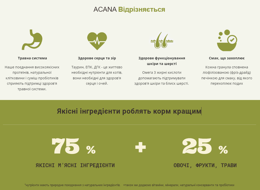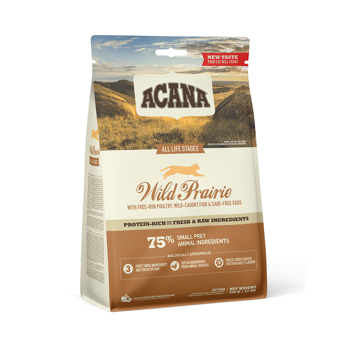 Формула ACANA Wild Prairie Cat створена у відповідності до рівнів поживності, встановлених AAFCO згідно профілю поживності кормів для котів всіх стадій життя.