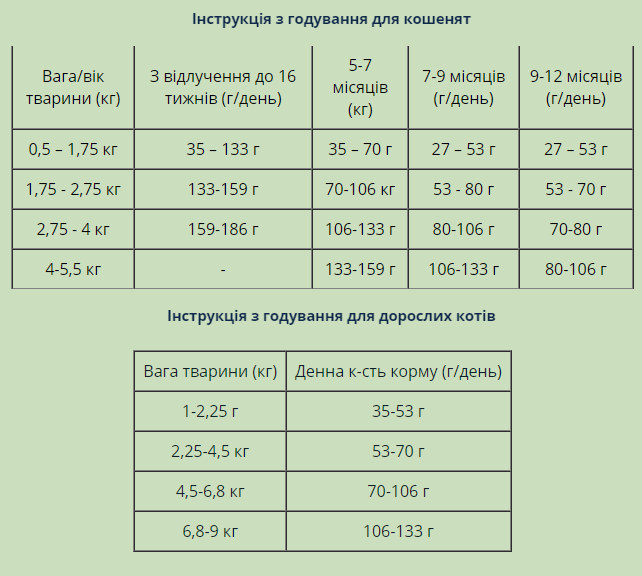Добавки (в 1 кг) Вітаміни: Вітамін A 10,000 МО/кг, Вітамін D3 750 МО/кг, Вітамін E 150 МО/кг, Таурин 0,1%.