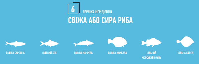 Сира цільна сардина (28%), сирий цільний хек (7%), сира цільна макрель (6%), сира камбала (5%), сирий цільний морський окунь (5%), сира цільна солея (5%), дегідратована макрель (5%), де гідратований оселедець (5%), де гідратована путасу (5%), жир минтая (5%), де гідратована біла риба (5%), дегідратована сардина (4%), соняшникова олія, червона сочевиця, зелена сочевиця, горошок, клітковина сочевиці, нут, квасоля строката, крохмаль з горошку, висушена ламінарія, гарбуз, мускатний гарбуз, свіжі цукіні, цільна морква, яблука, свіжі груші, висушений корінь цикорію, свіжа капуста кале, свіжий шпинат, свіжа зелень буряка, свіжа зелень ріпи, цільна журавлина, цільна чорниця, ягоди, куркума, розторопша, корінь лопуха, лаванда, корінь алтеї, шипшина.