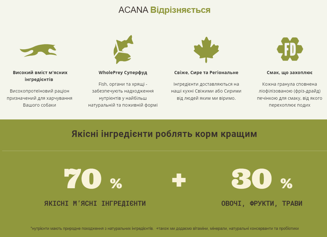 Кожна рецептура ACANA створюється із особливою турботою, з преміальних інгредієнтів, від самого початку і до фінального етапу приготування.
