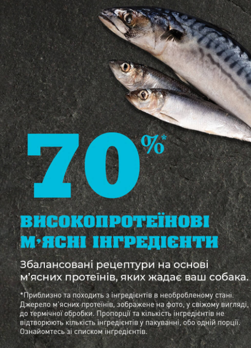• Перші ТРИ інгредієнти у списку – це свіжий або сирий оселедець, макрель та камбала, що робить цю рецептуру сповненою нутрієнтів та пропонує вашому собаці високопротеїновий раціон з найвищим вмістом м’ясних інгредієнтів.