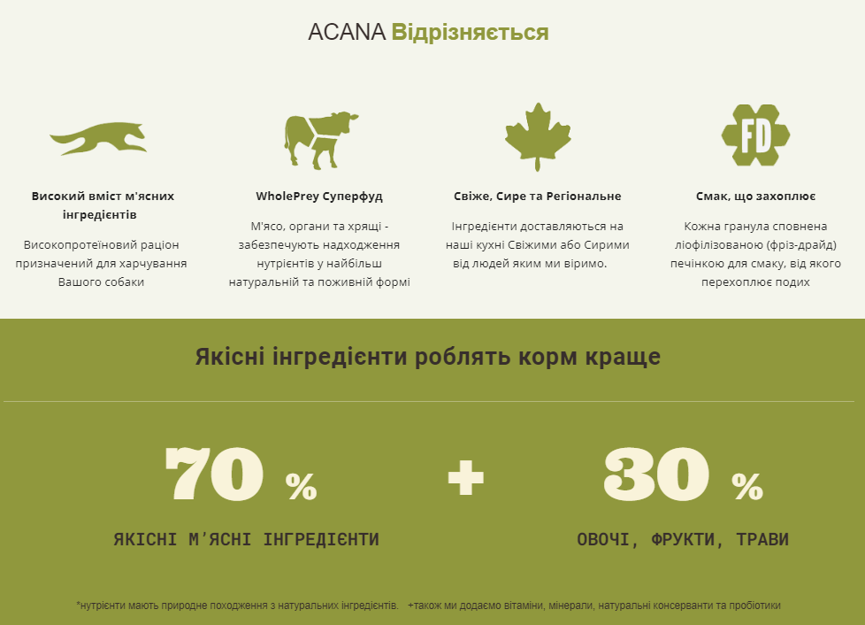 Кожна рецептура ACANA створюється із особливою турботою, з преміальних інгредієнтів, від самого початку і до фінального етапу приготування.