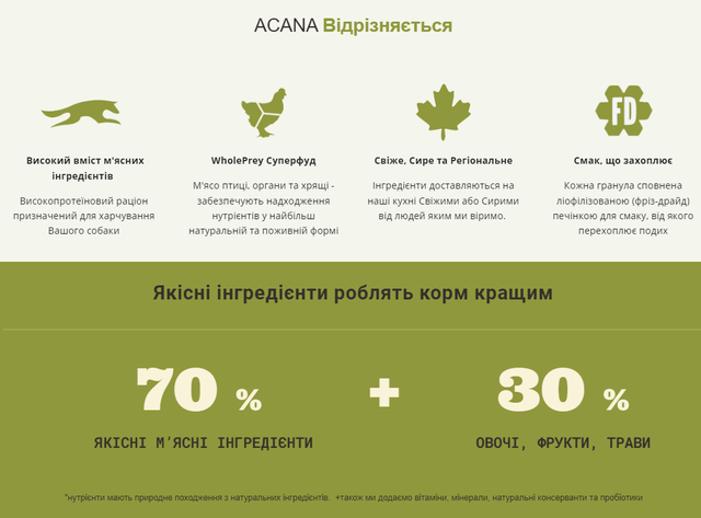 Кожна рецептура ACANA створюється із особливою турботою, з преміальних інгредієнтів, від самого початку і до фінального етапу приготування.