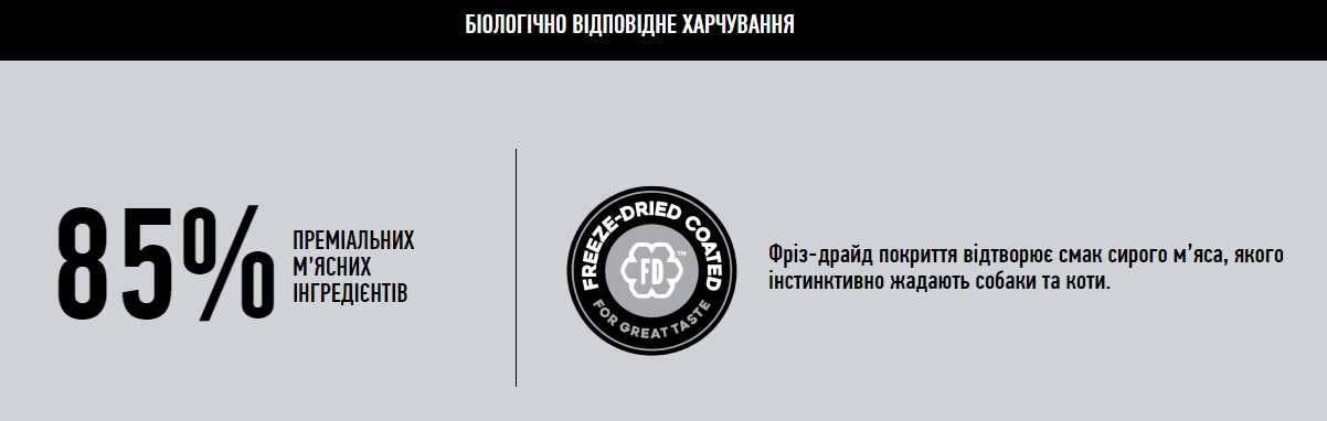 • 1/3 інгредієнтів – це цільна риба, висушена при температурі 90°C. Відмінне концентроване джерело високопоживних протеїнів, надходження яких неможливо забезпечити додаючи лише свіжу рибу.