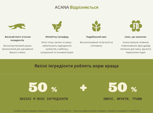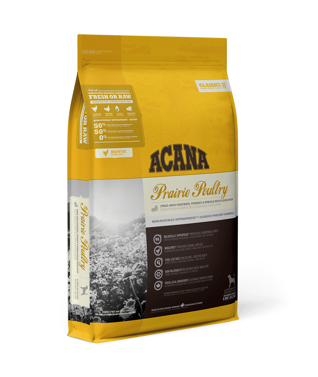 Ваш собака біологічно пристосований до харчування  високопротеїновими раціонами з якісних м’ясних інгредієнтів. Раціон ACANA Prairie Poultry  виготовлений з м’яса курчат та індички, вирощених на вільному вигулі та  представлений у співвідношенні WholePrey, що включає м’ясо птиці, органи, хрящі та яйця від курей вільного вигулу.