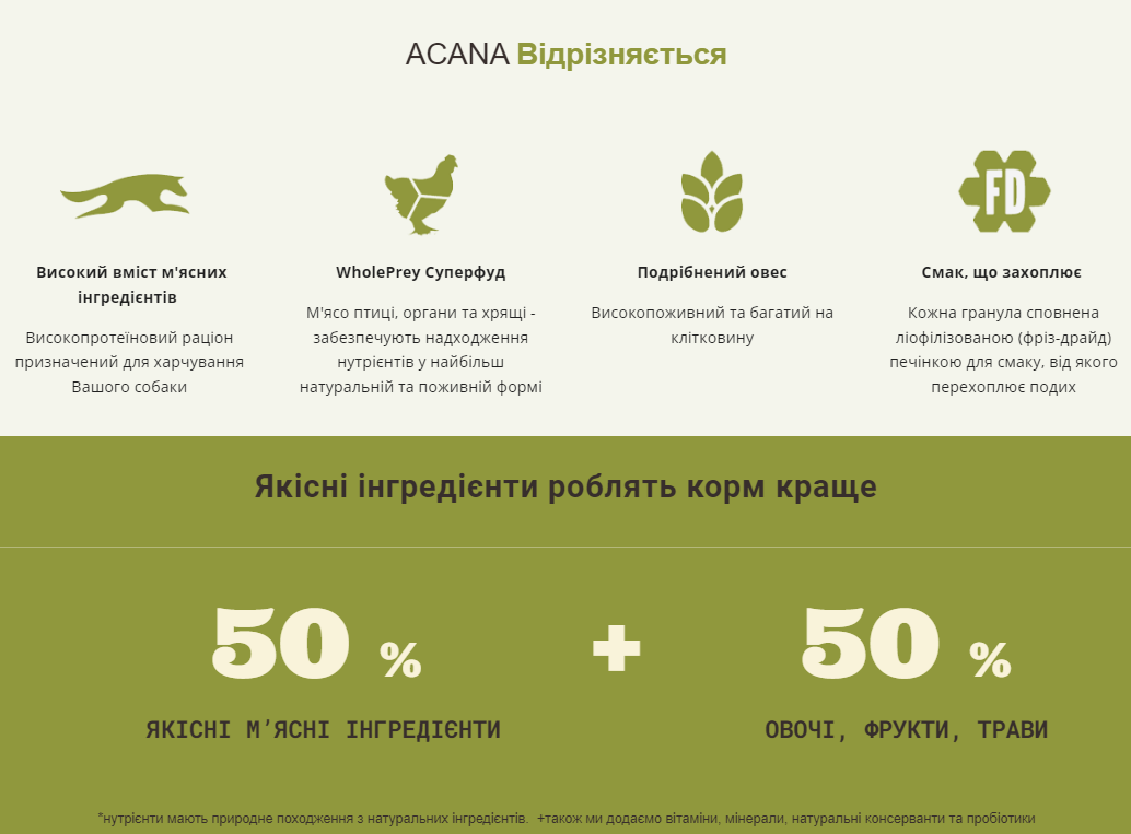 Висушене м’ясо курчати (25%), подрібнений овес (23%), свіже м’ясо курчати (5%), свіжий лівер курчати (печінка, серце, нирки) (5%), червона сочевиця, зелений горох, зелена сочевиця, свіже м’ясо індички (4%), свіжі цільні яйця (4%), курячий жир (4%), боби гарбанзо, жовтий горох, цільний овес, жир з оселедця, в’ялена на сонці люцерна, клітковина сочевиці, висушена ламінарія, гарбуз, мускатний гарбуз, пастернак, капуста Кале, шпинат, морква, яблука, груші, ліофілізована печінка курчати (0,1%), сіль, журавлина, чорниця, корінь цикорію, корінь куркуми, розторопша, корінь лопуха, лаванда, корінь алтея, шипшина. ДОБАВКИ (в 1 кг): суміш токоферолів природного походження. Харчові добавки:  вітамін A 7500 МО, вітамін D3 500 МО, вітамін E 100 МО, холіну хлорид 500 мг, цинку хелат амінокислоти гідрат 100 мг, вітамін B5 12,5 мг, сухі продукти ферментації Enterococcus faecium 600х10^6КУО.
