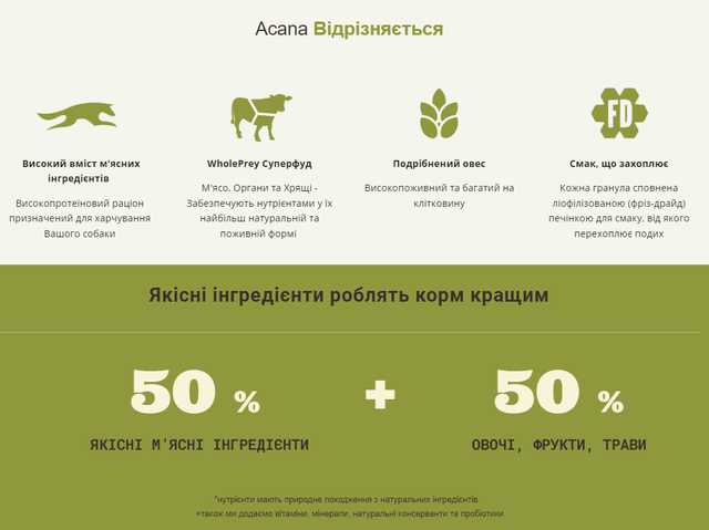 - На 50% створено з якісних м’ясних інгредієнтів та на 50% збалансовано корисними зерновими, овочами, фруктами та нутрієнтами.