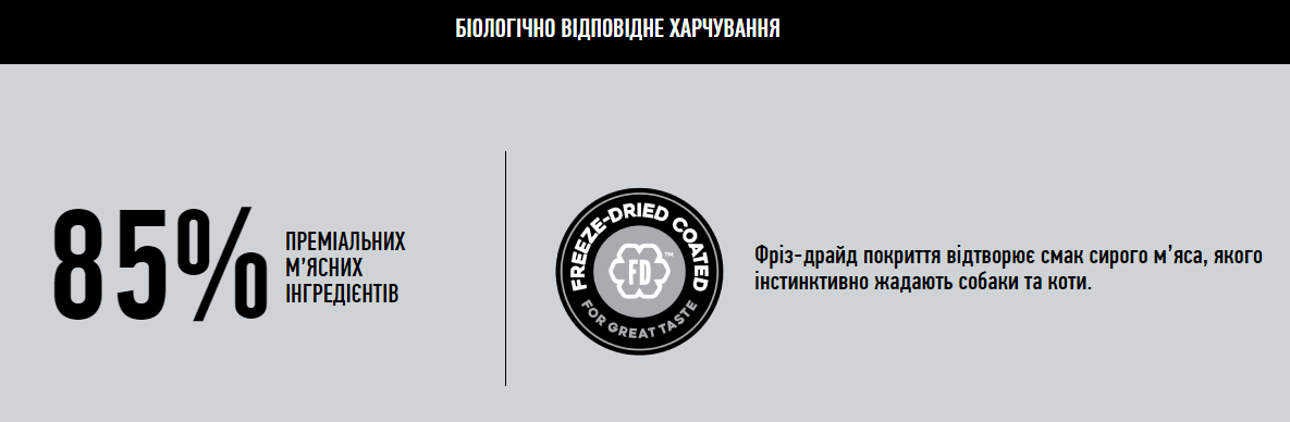 Собаки – від природи м’ясоїдні, тому вони потребують Біологічно Відповідних раціонів, багатих на різноманітні види свіжих м’ясних інгредієнтів.