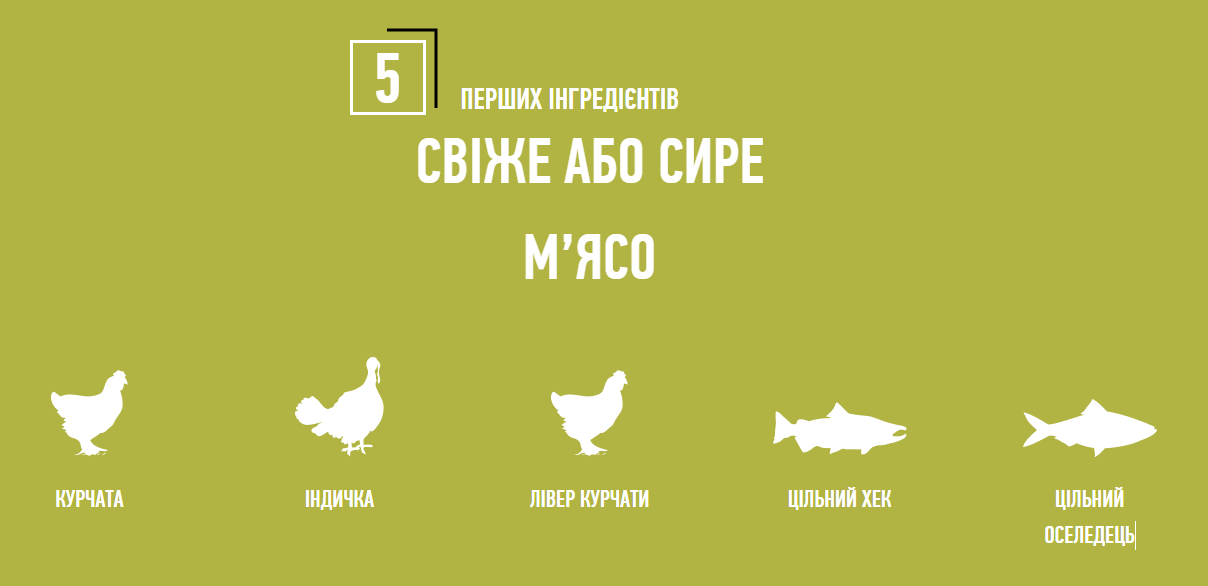• Перші 5 інгредієнтів – це свіжі або сирі інгредієнти з птиці та риби.