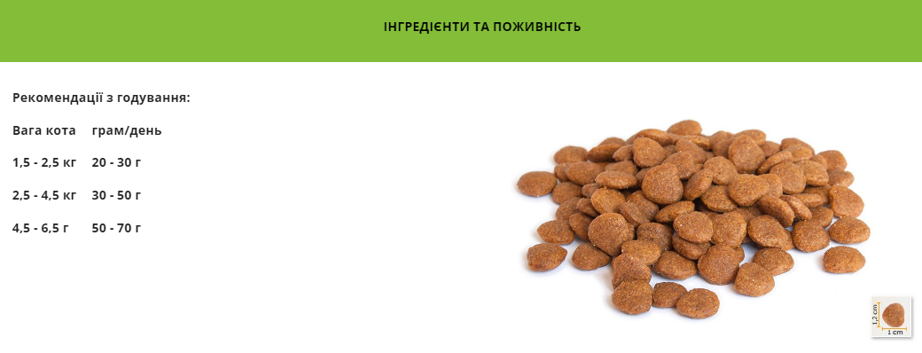 Гарантований аналіз: Протеїн 30 %, Жир 12 %, Зола 7 %, Клітковина 3 %, Омега-6 3,6 %, Омега-3 0,65 %, Магній 0,097%, Кальцій 1,5%, Фосфор 1,1%.