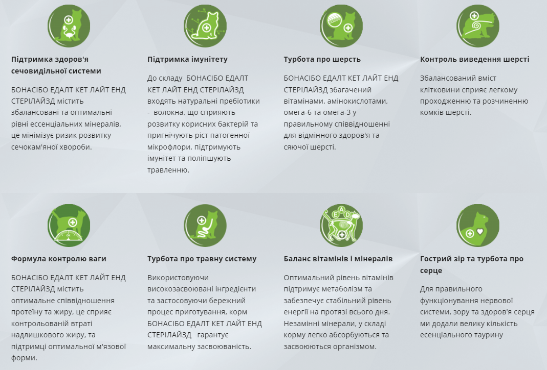 Формула БОНАСІБО ЕДАЛТ КЕТ ЛАЙТ ЕНД СТЕРІЛАЙЗД створена для стерилізованих котів та котів із зайвою вагою. Раціон ретельно  збалансований за  рівнями протеїну та жиру, сприяє здоровому  контролю ваги та забезпечує повноцінне надходження всіх поживних речовин та дивовижний смак корму.