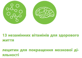 Містить загальнозміцнюючий збалансований комплекс із 13-ти незамінних вітамінів що сприяють зміцненню імунітету, функції мозку і серцево-судинної системи, добавка необхідна для регенерації організму при фізичних навантаженнях, стрессі, вагітності і лактації.